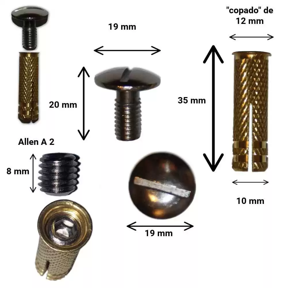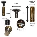 El diámetro del taco del tornillo es de 10 mm y el de la cabeza del tornillo de cierre 19 mm.